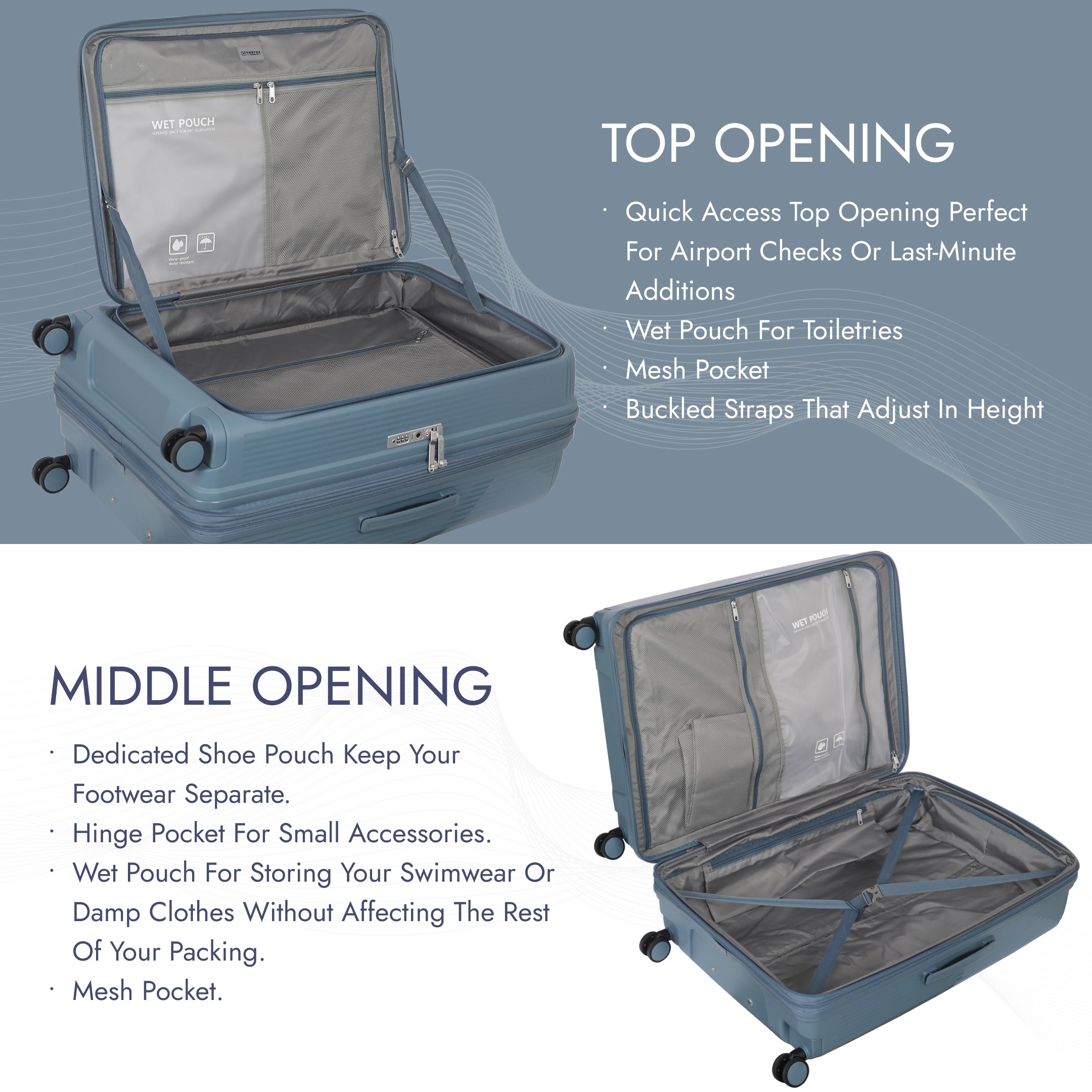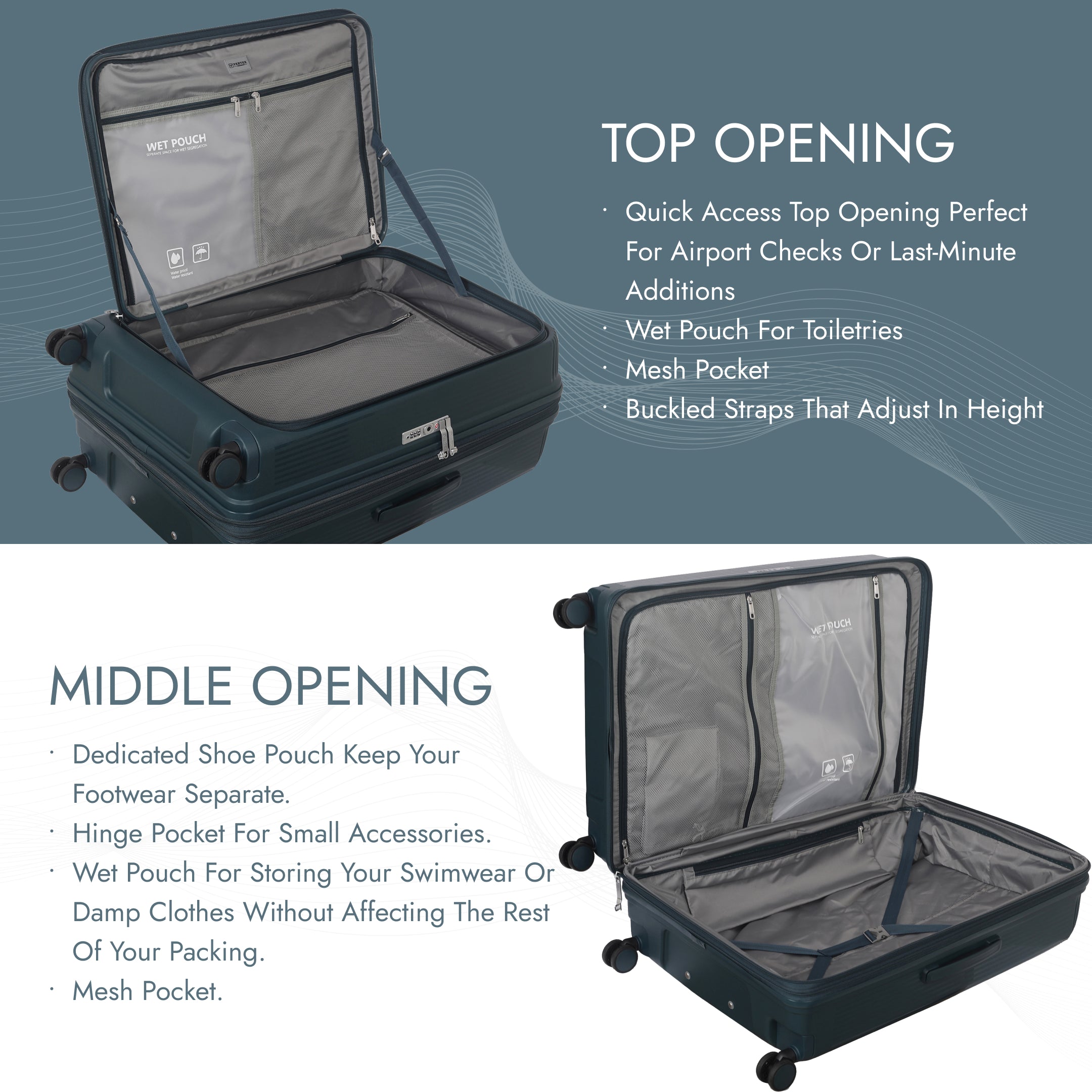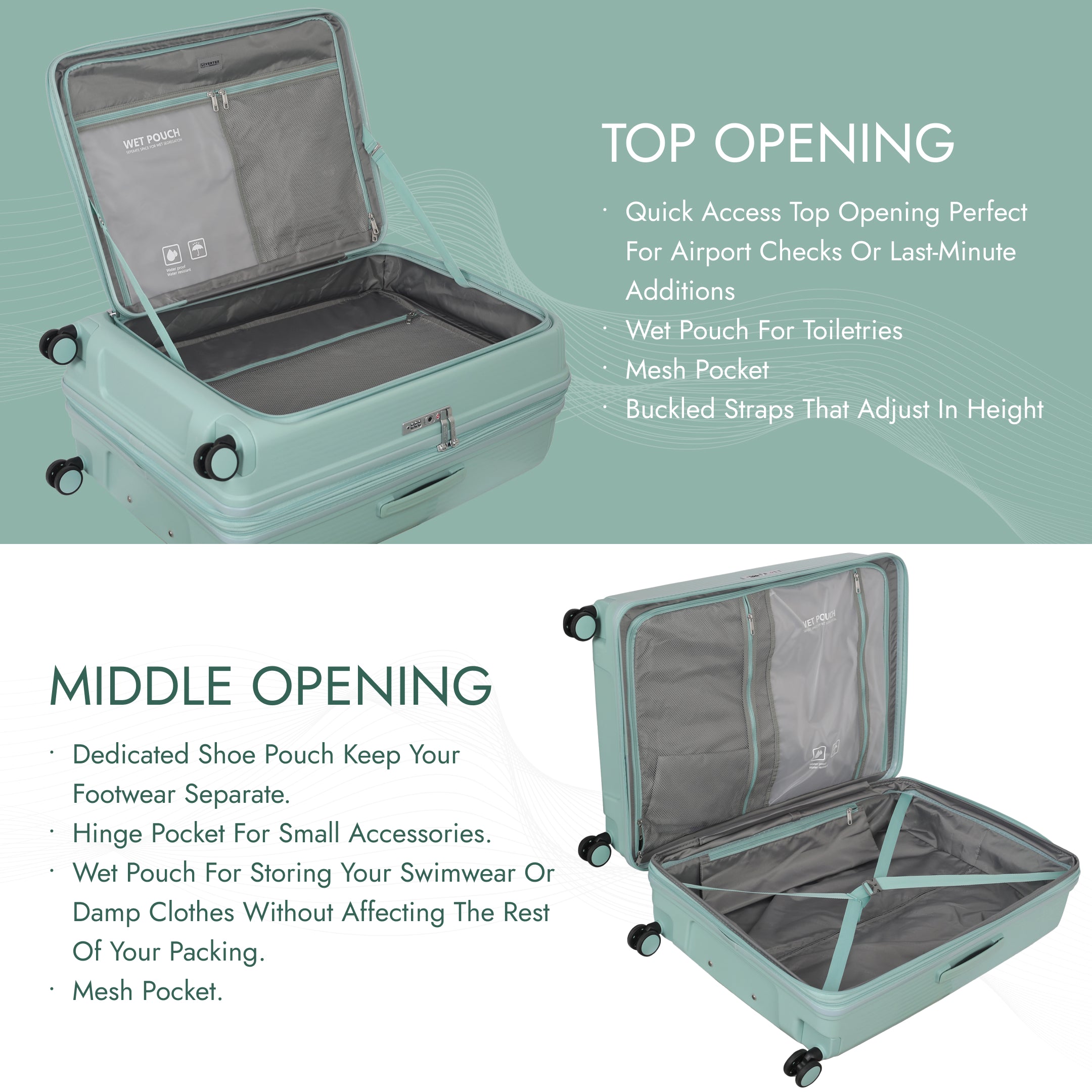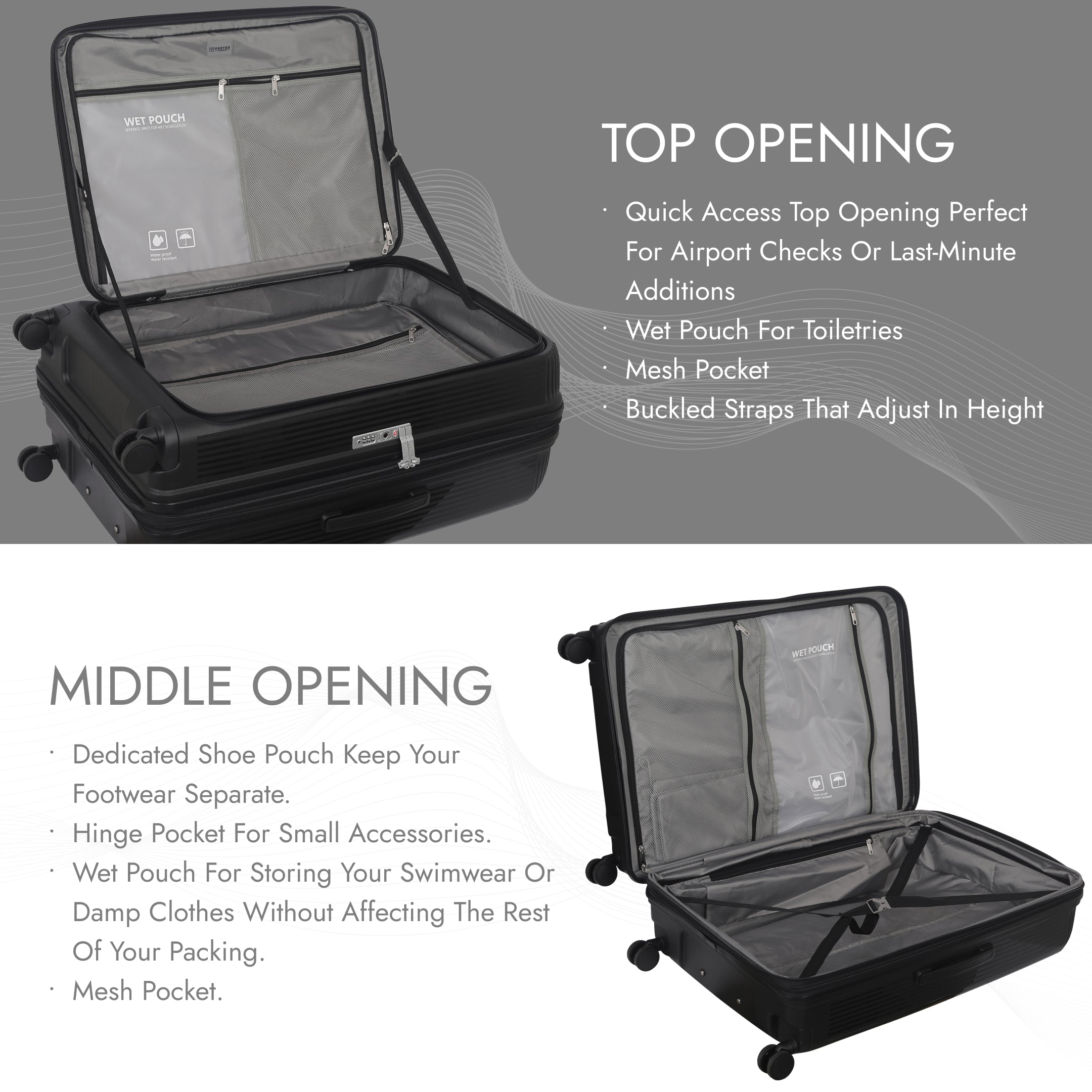 - Spacious Interior with Wet Pack & Shoe Pouch Inside